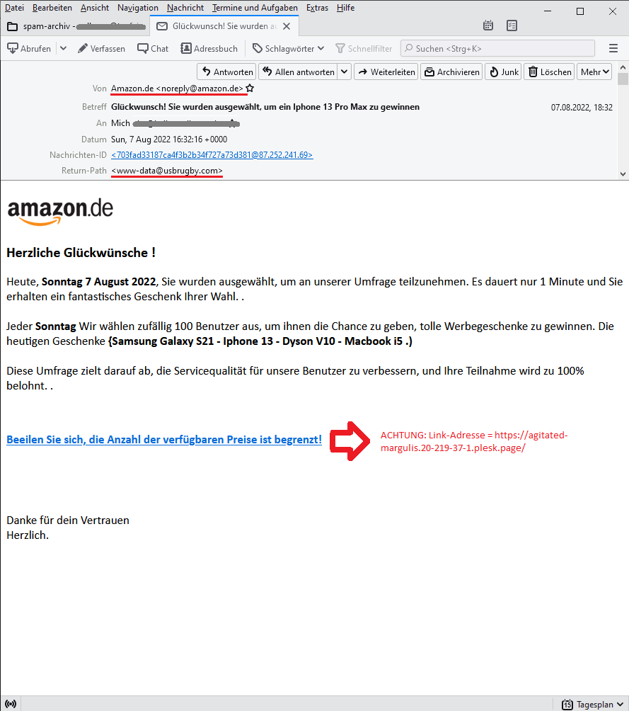 So kann eine Phishing-E-Mail, die vorgibt, von Amazon zu stammen, eine Domain in der E-Mail-Adresse wie „amazon-kundenservice.com“ anstelle von „amazon.com“ führen. Es kommt aber auch vor, dass die „Von:“ E-Mail-Adresse offensichtlich von der richtigen Domain stammt. Diese Angabe ist natürlich gefaket, denn wenn du dir die Kopfzeilen der nachfolgenden Nachricht anschaust, wirst du schnell festellen, dass diese Nachricht nicht von Amazon stammt.