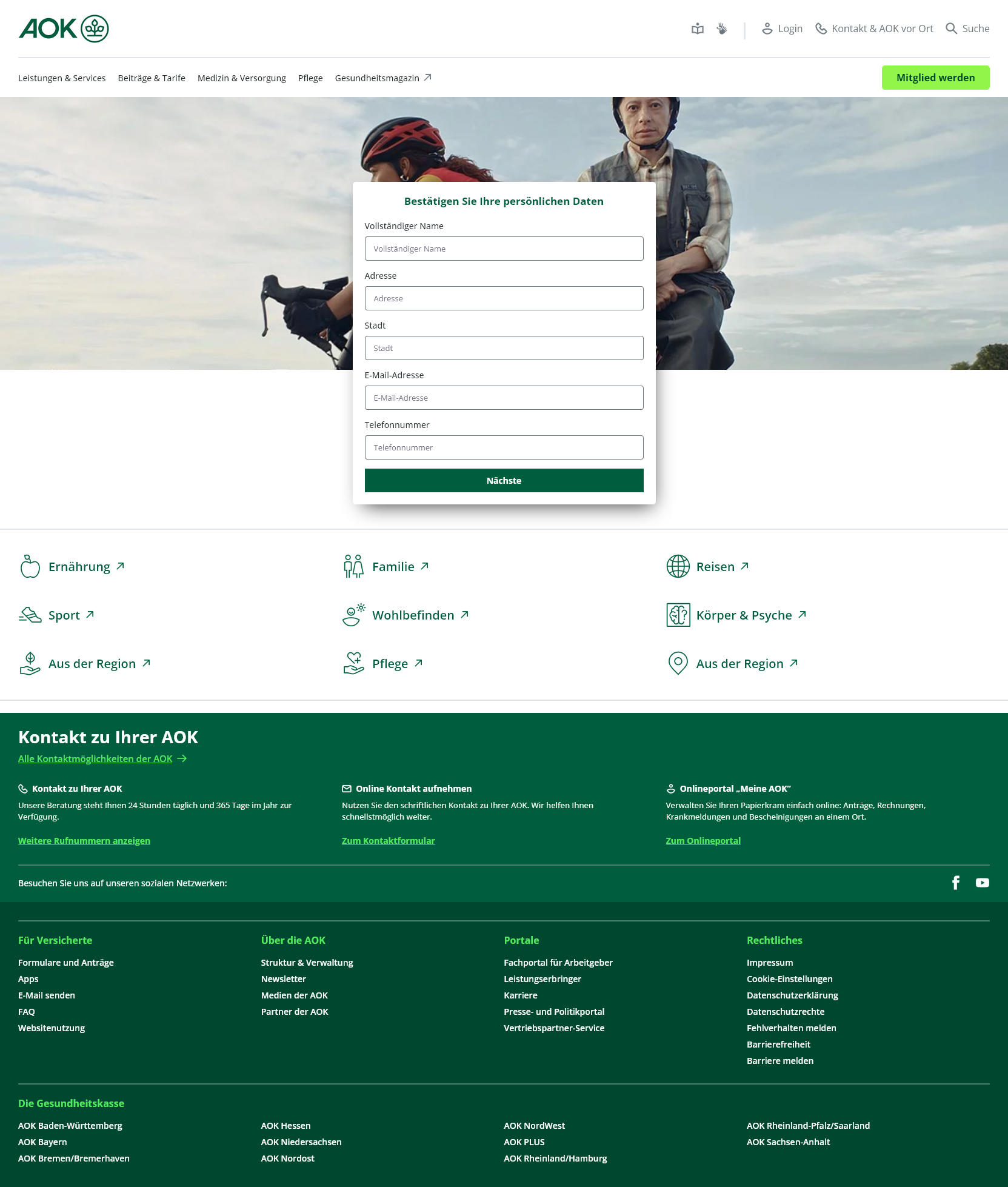 Abb. 2: Screenshot der gefälschten AOK Website. Hier werden in einem ersten Schritt persönlich Daten, wie Name, Adresse, E-Mail und Telefonnummer, abgefragt.