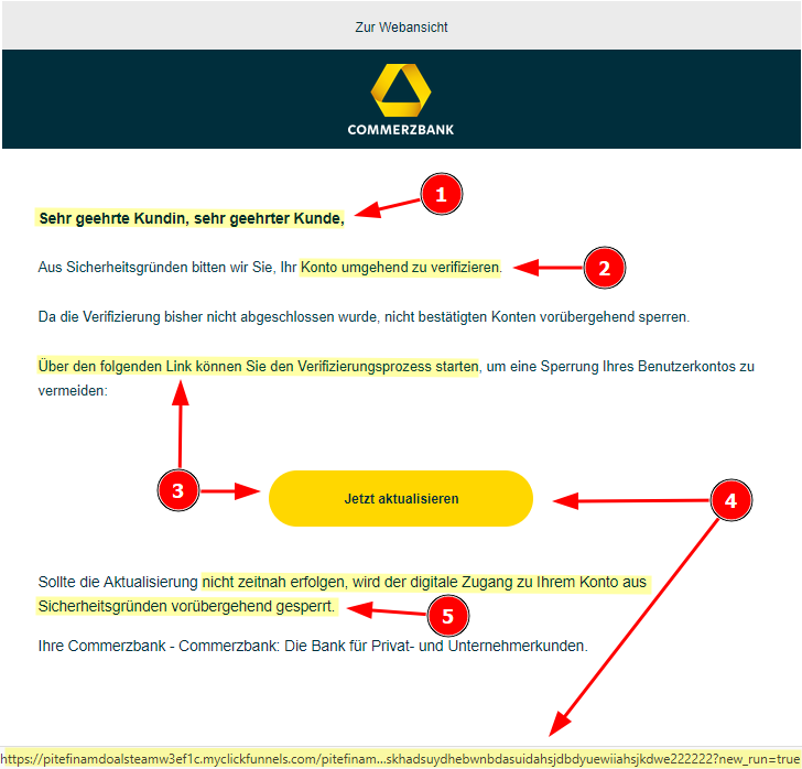 - Hyperlink zu externer Phishing-Seite: Der Klick auf den enthaltenen Button führt nicht zur echten Commerzbank, sondern zu einer externen Domain, „https://pitefinamdoalsteamw3ef1c.myclickfunnels.com/pitefinamdoalsteam…“ mit gefälschter Login-Seite, siehe Abb. 1, Punkt 3 und 4.
