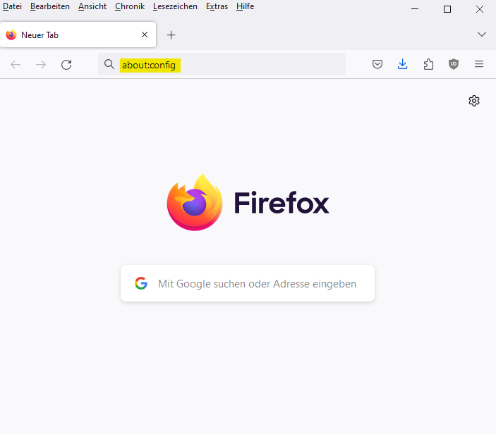 Öffne den Firefox-Browser und gib oben in der Browser-Adresszeile about:config ein. Bestätige deine Eingabe indem du die Return- oder Enter-Taste drückst. Durch die Eingabe von about:config wird der Firefox-Konfigurationseditor geöffnet.