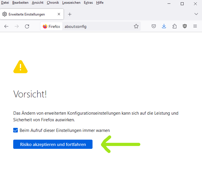 Es erscheint ein Warnhinweis, der dich darauf aufmerksam macht, dass das Ändern von Konfigurationseinstellungen Auswirkungen auf die Leistung und Sicherheit von Firefox haben kann. Nehme diesen Hinweis zur Kenntnis und klicke auf den Button mit der Aufschrift „Risiko akzeptieren und fortfahren“.
