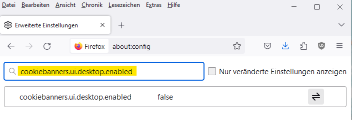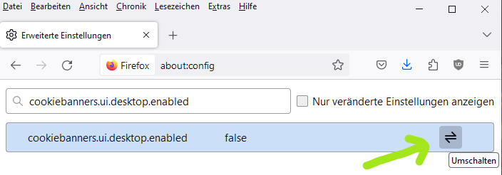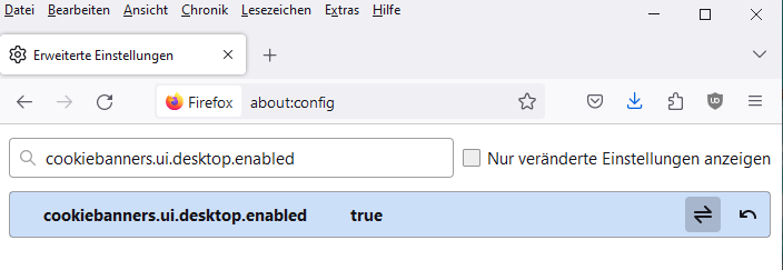 Klicke auf die beiden entgegengesetzten Pfeile hinter cookiebanners.ui.desktop.enabled false. Damit schaltest du die Einstellung auf true, somit auf wahr um.