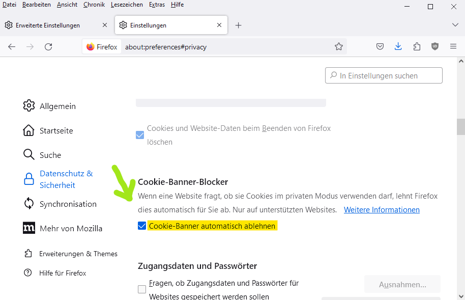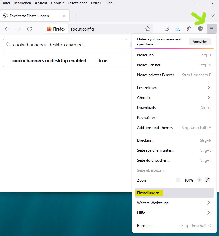 HINWEIS: Damit du den Cookie-Banner-Blocker aktivieren kannst, musst du Firefox mindestens in der Version 120.0 (Release am 21. November 2023) verwenden oder den Browser auf die neueste Version aktualisieren.