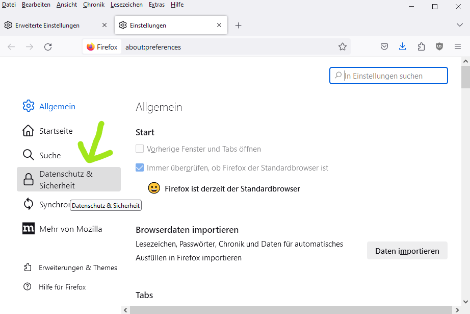 Rufe in der linken Menüleiste durch einen Klick den Unterpunkt „Datenschutz & Sicherheit“ auf.