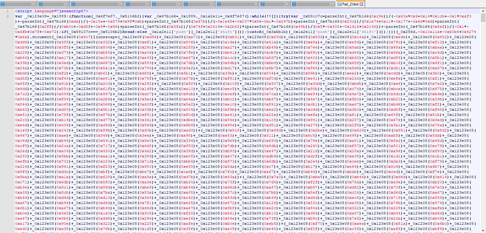 Der Quelltext / Source-Code der angehängten HTML-Datei „Part_2.html“ wurde unter Zuhilfenahme der HTML-<script>-Tags in der Scriptsprache JavaScript geschrieben. Schauen wir uns den Quellcode und somit das JavaScript der angehängten HTML-Datei an, stellen wir fest, dass das Script nicht klar zu lesen ist. Das Script wurde verschleiert: