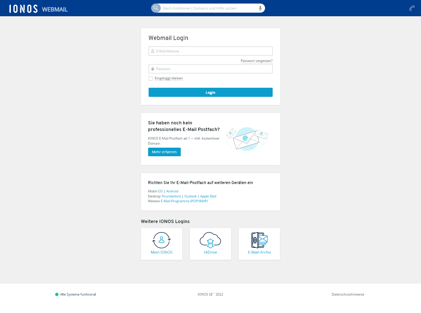 Ansicht der originalen IONOS 1&1 Webmail-Login-Seite: