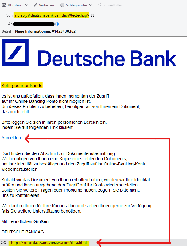 Beispiel einer aktuellen, Phishing-Mail von der Deutsche Bank AG