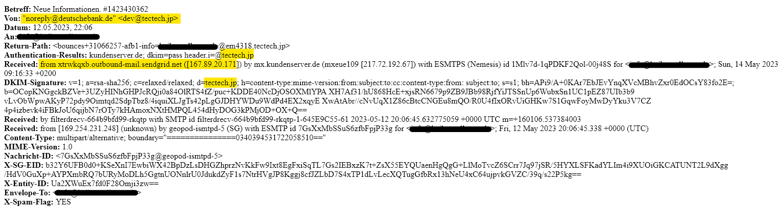Anhand der Kopfzeilen kannst du feststellen, dass es hier bereits eine Diskrepanz zwischen den beiden Angaben in der Absender-Adresse der Phishing-Mail gibt: noreply@deutschebank.de wurde als Name des Absenders angegeben und dev@tectech.jp als versendende E-Mail-Adresse. Diese beiden Angaben passen nicht zusammen. Sie stellen eine offensichtliche Widersprüchlichkeit dar und sind ein Indiz dafür, dass es sich hier um eine Phishing-Mail handelt.