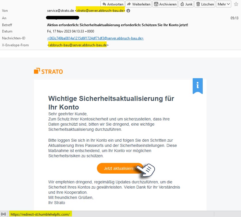 - Ein Blick auf die Absenderangabe „Von: service@strato.de <strato@server.abbruch-bau.de>„ zeigt sehr offensichtlich, dass diese E-Mail nicht von STRATO stammen kann.