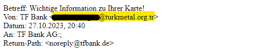 - Im E-Mail-Header ist als Absender: TF Bank <xxx@ turkmetal.org.tr> angegeben. Diese E-Mail-Adresse ist eindeutig nicht von der TF Bank. Bei Durchsicht der weiteren Kopfzeilen („Received from“) ist der tatsächlich genutzte Mailserver erkennbar. Dieser ist ebenfalls nicht der TF Bank zuzuordnen.