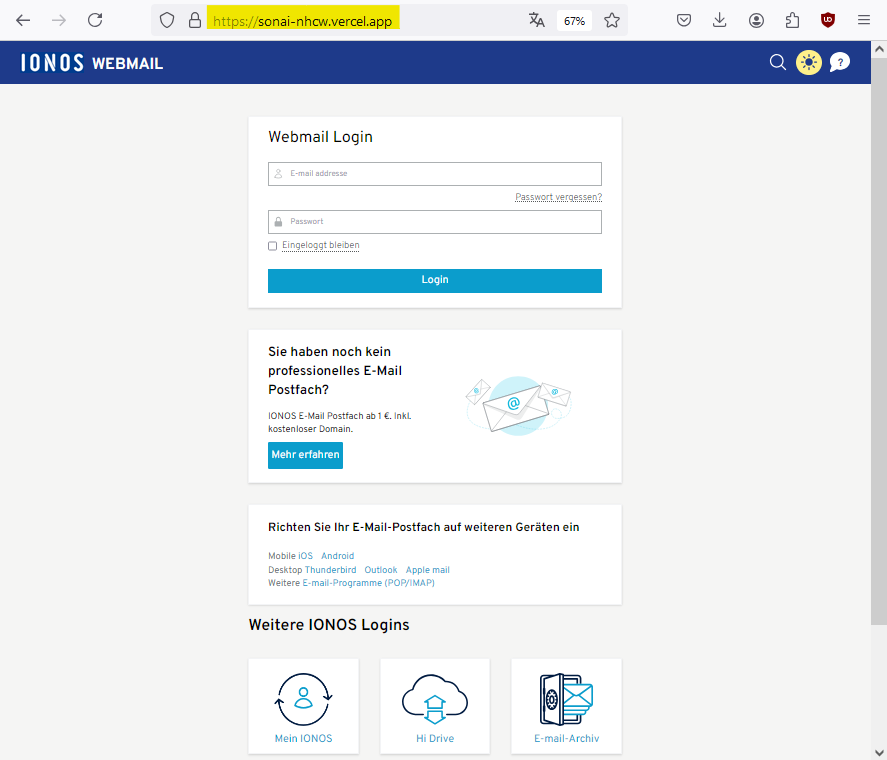 Hinter der URL, auf die der Link in der Phishing-Mail verweist (http://sonai-nhcw.vercel.app), haben die böswilligen Akteure ein Phishing-Formular hinterlegt, dass das Webmail Login von IONOS imitiert: