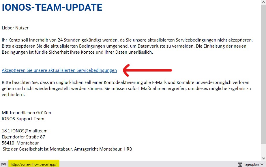 - Eine böswillige Phishing-Mail von der IONOS Kundenbetreuung mit dem Betreff „Ergreifen Sie sofort Maßnahmen“