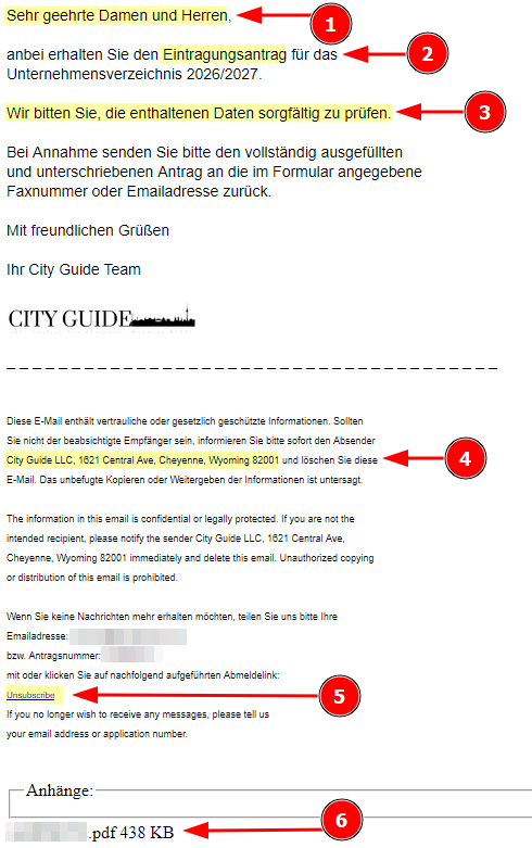- Absender ist City Guide LLC, Wyoming (USA). Für ein angeblich deutsches oder europäisches Unternehmensverzeichnis ist das ungewöhnlich.