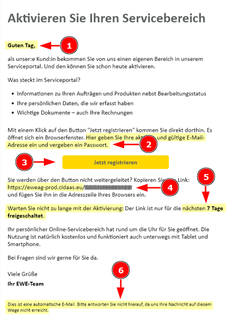 In der nachfolgenden Abbildung siehst du eine E-Mail, eine Einladung zum Serviceportal der EWE. Sie enthält eine Aufforderung zum Handeln: „Aktivieren Sie Ihren Servicebereich“, eine unpersönliche Anrede (1), einen HTML-Button mit der Aufschrift „Jetzt registrieren“ (3), eine „noreply@…“-Adresse als Absender und Handlungsdruck (5).