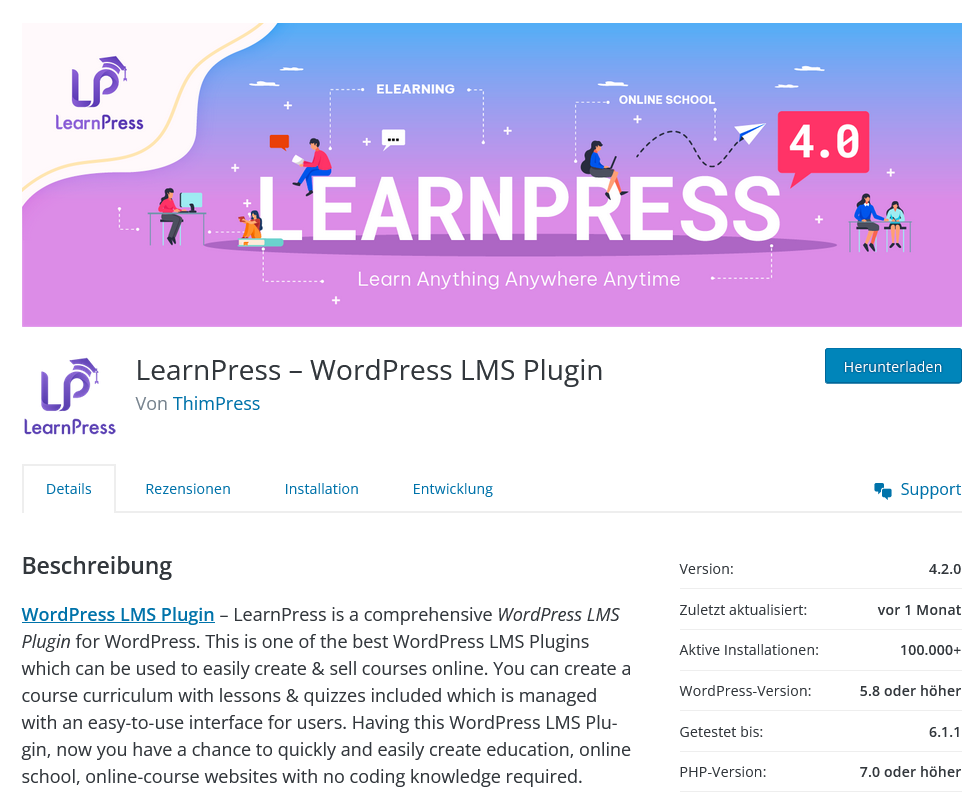 „LearnPress“ ist ein Plugin für ein Lernmanagementsystem (LMS), mit dem Websitebetreiber, die mit dem CMS WordPress arbeiten, Online-Kurse, Lektionen und Quiz erstellen und verkaufen können.